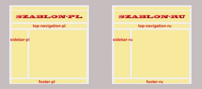 Weźmy jako przykład, dodatkowy szablon w języku rosyjskim. Nie chcielibyśmy, by menu w języku polskim pojawiało się tam, gdzie powinna być tylko cyrylica - lub odwrotnie, więc drugi szablon w języku rosyjskim w naszym przykładzie, musi posiadać inaczej nazwane, unikalne w nazwach bloki menu, np. tak: